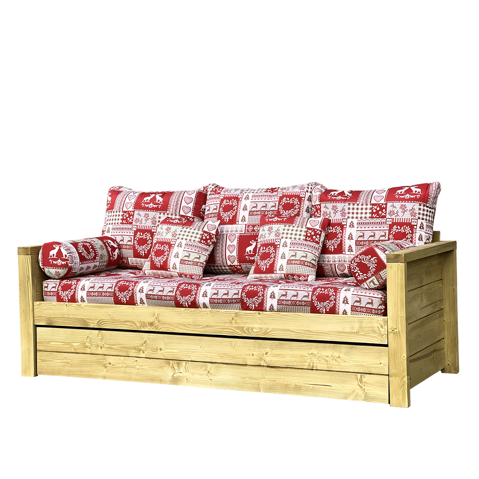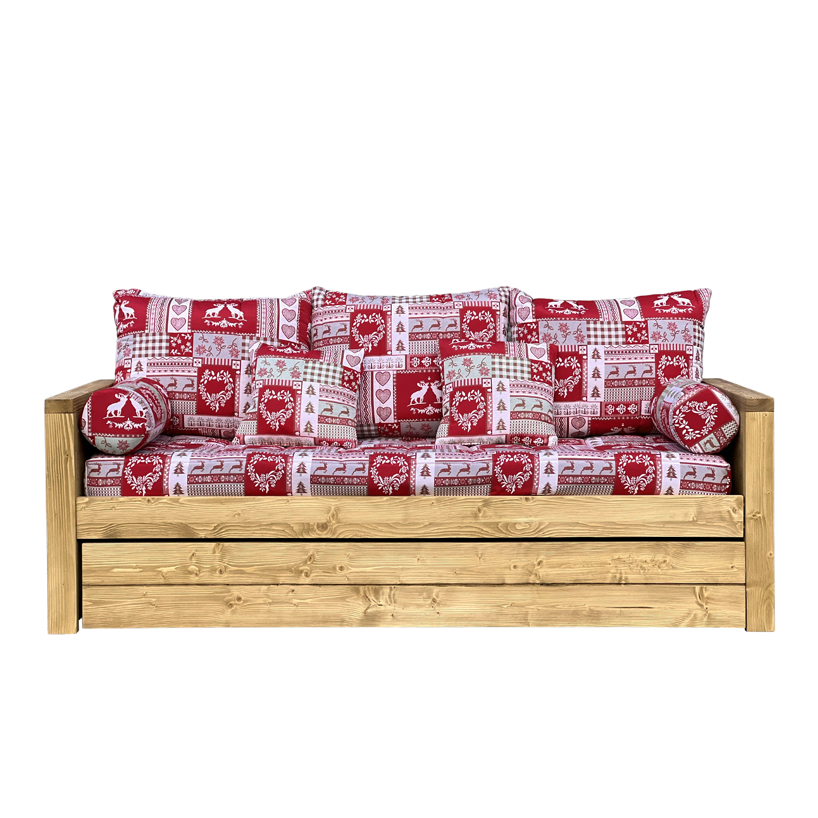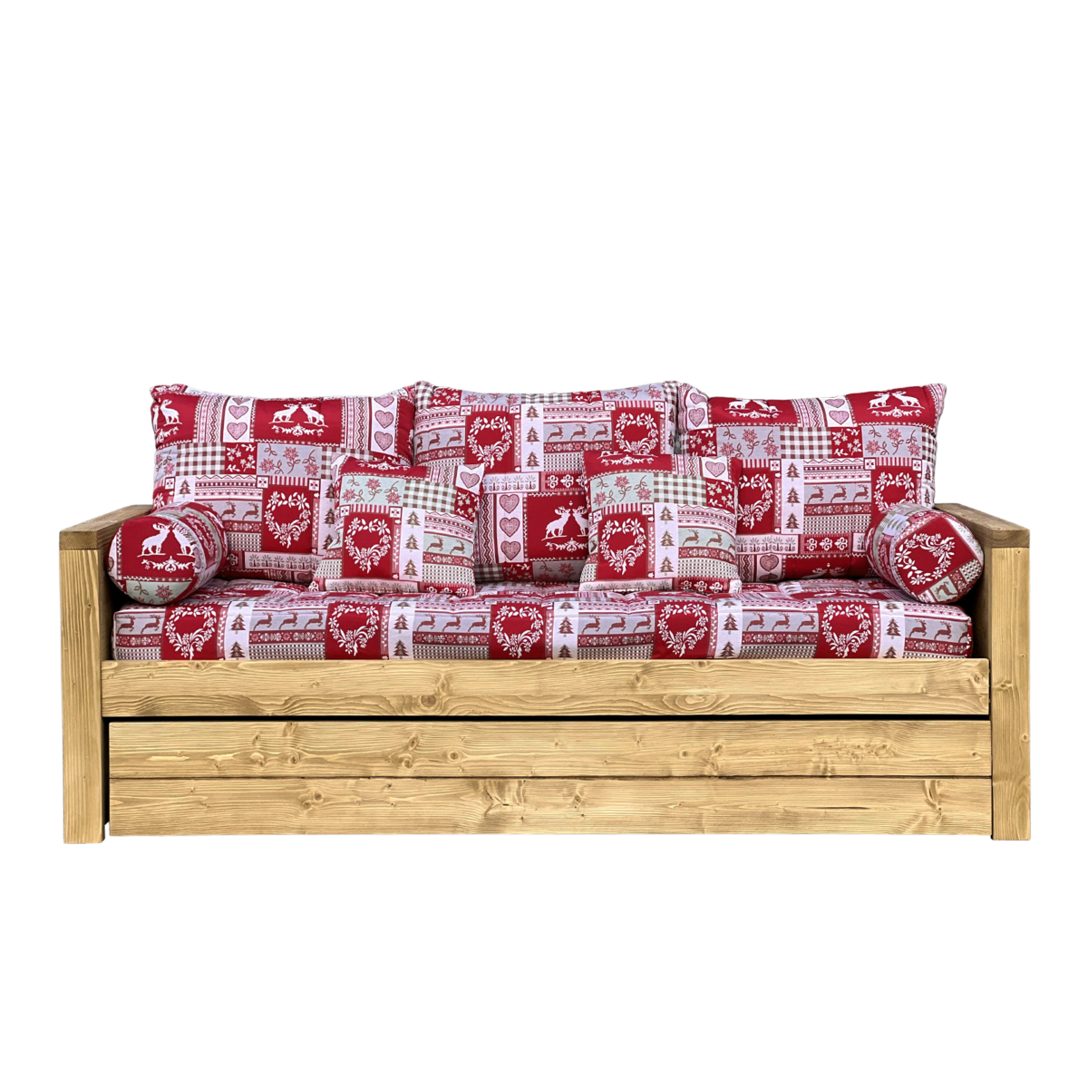 Canapé convertible Gigogne en couchage 2 x (80×190 cm) pour votre chalet de montagne. Le modèle présenté est confectionné avec le tissus « Morzine Rouge ». Découvrez un très grand choix de tissus montagne ou uni. Son matelas d’assise très confortable de 14 cm d’épaisseur a une densité de 35 kg/m3 et bénéficie d’un confort équilibré. Le matelas du lit gigogne est en BULTEX et fait 12 cm d’épaisseur. Sa structure en bois massif est très robuste et son esthétique est caractéristique du style montagnard. Découvrez notre sélection de canapés gigogne fabriqués de façon artisanale. Ainsi, vous apprécierez leur robustesse et leur confort.