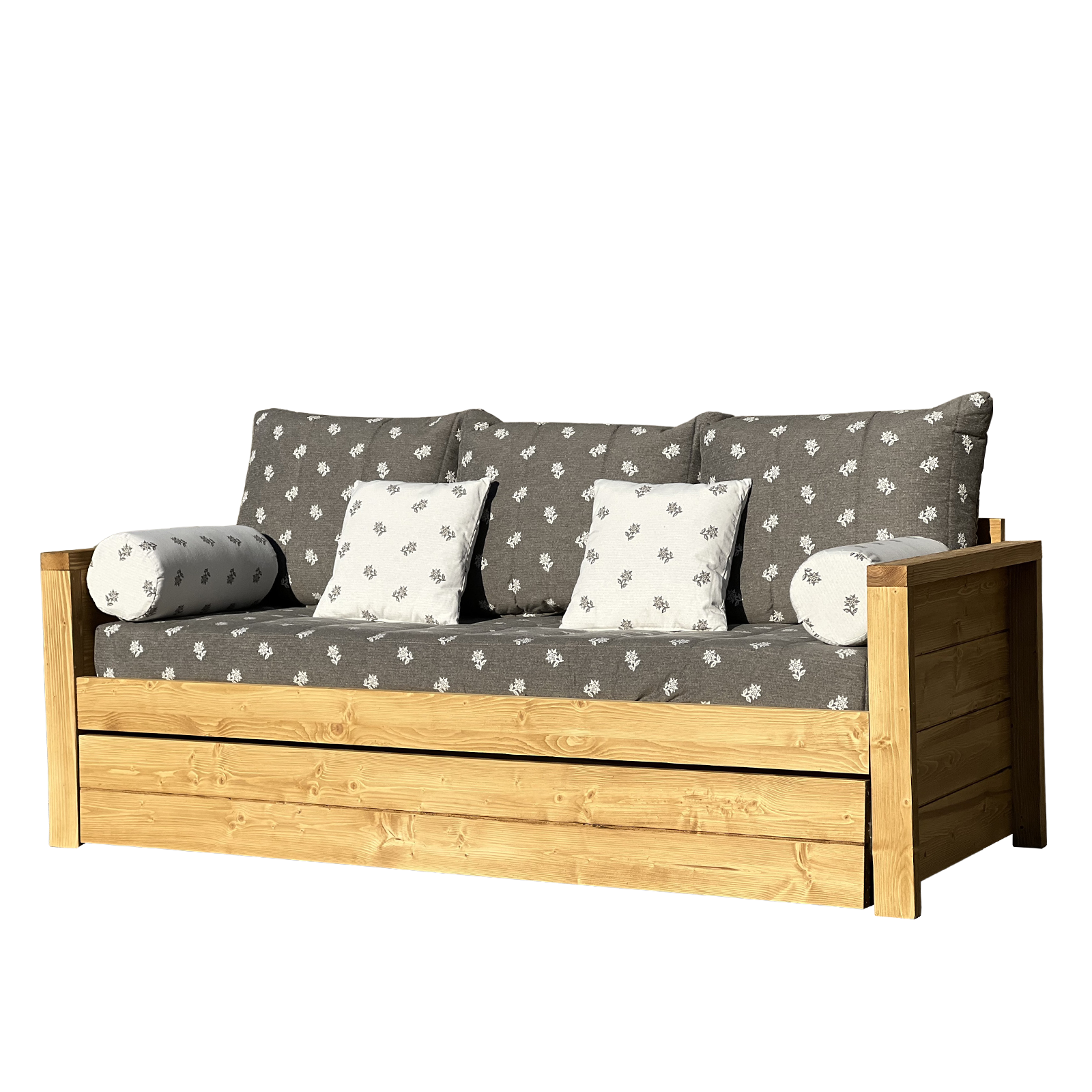 Le canapé Montana est fabriqué en pin massif, avec une assise en mousse Bultex HR 35 kg/m³ d’épaisseur 14 cm.