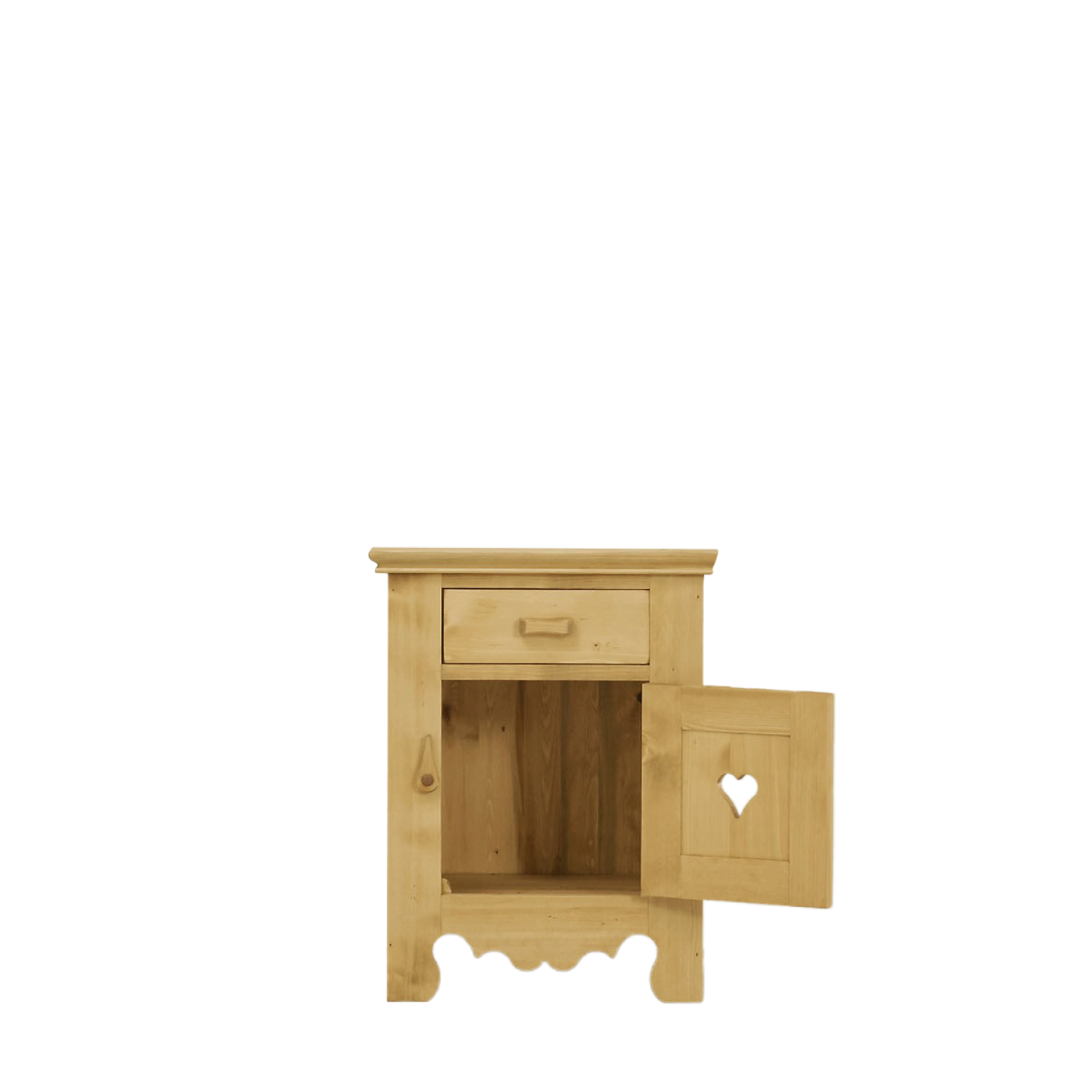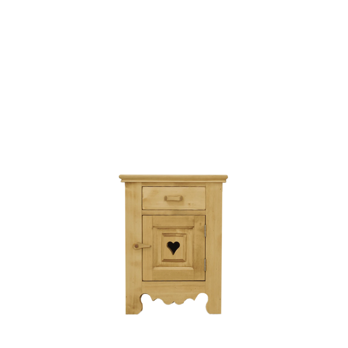 Ce chevet Chamonix en pin massif plaira aux amateurs d’ambiance chalet traditionnel. On aime son piétement sculpté et sa découpe cœur, typiquement montagnards. Pratique, il est doté d’un tiroir et d’un petit placard, pour vous permettre de ranger facilement vos effets personnels. Vous pourrez y déposer votre plus belle lampe de chevet pour créer une ambiance cocooning.