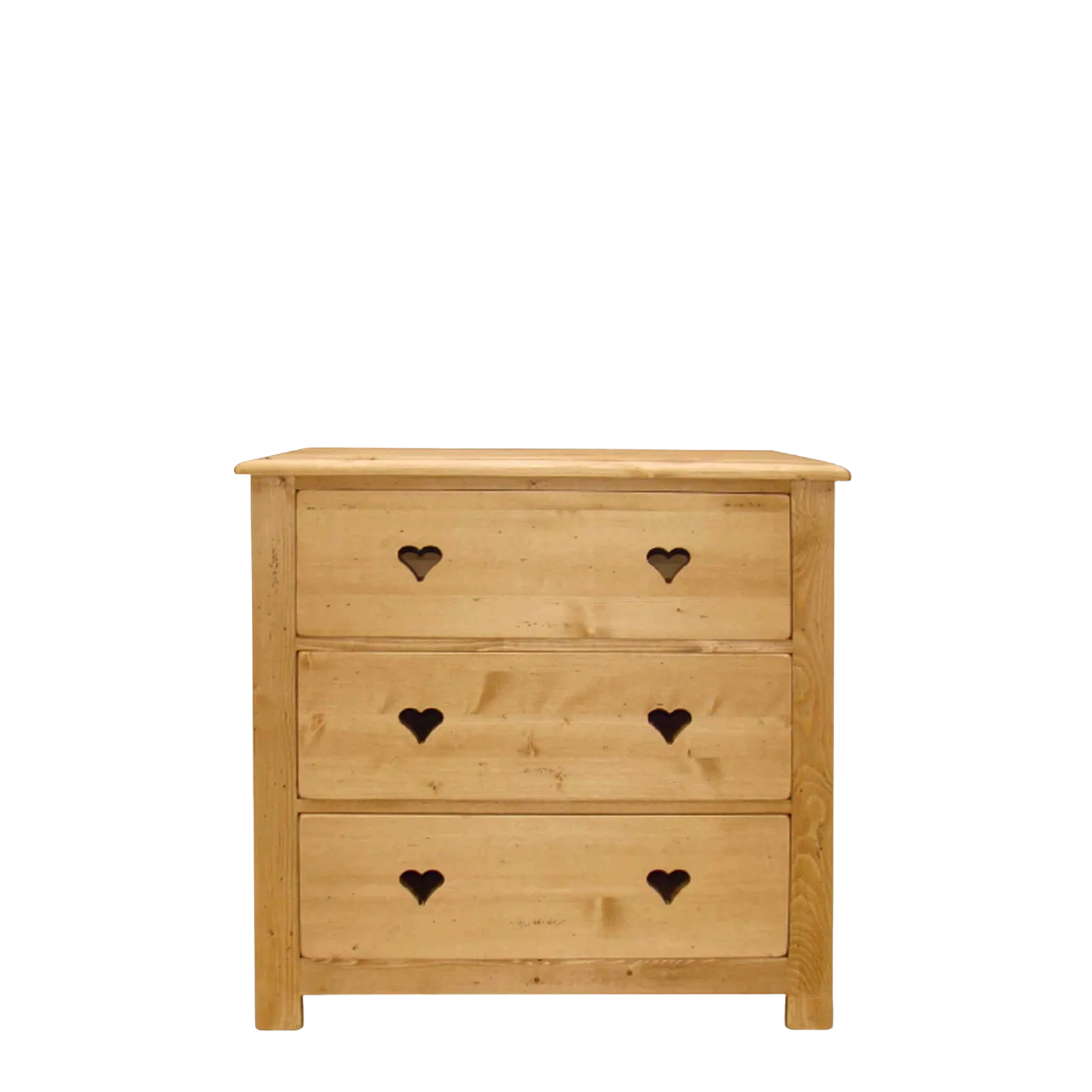 Cette commode au style montagne vous permettra d’ajouter un espace de rangement fonctionnel à votre chambre, tout en lui conférant du caractère ! Elle dispose de 3 grands tiroirs pour ranger vos vêtements et votre linge de lit. Son plateau vous permettra d’y déposer quelques affaires ou bien de le décorer à l’aide de petits objets ou de jolis cadres photos. En pin massif teinté ciré, elle apportera une touche chaleureuse dans la chambre à coucher. Le charme de cette commode est renforcé par les cœurs découpés directement dans ses tiroirs.