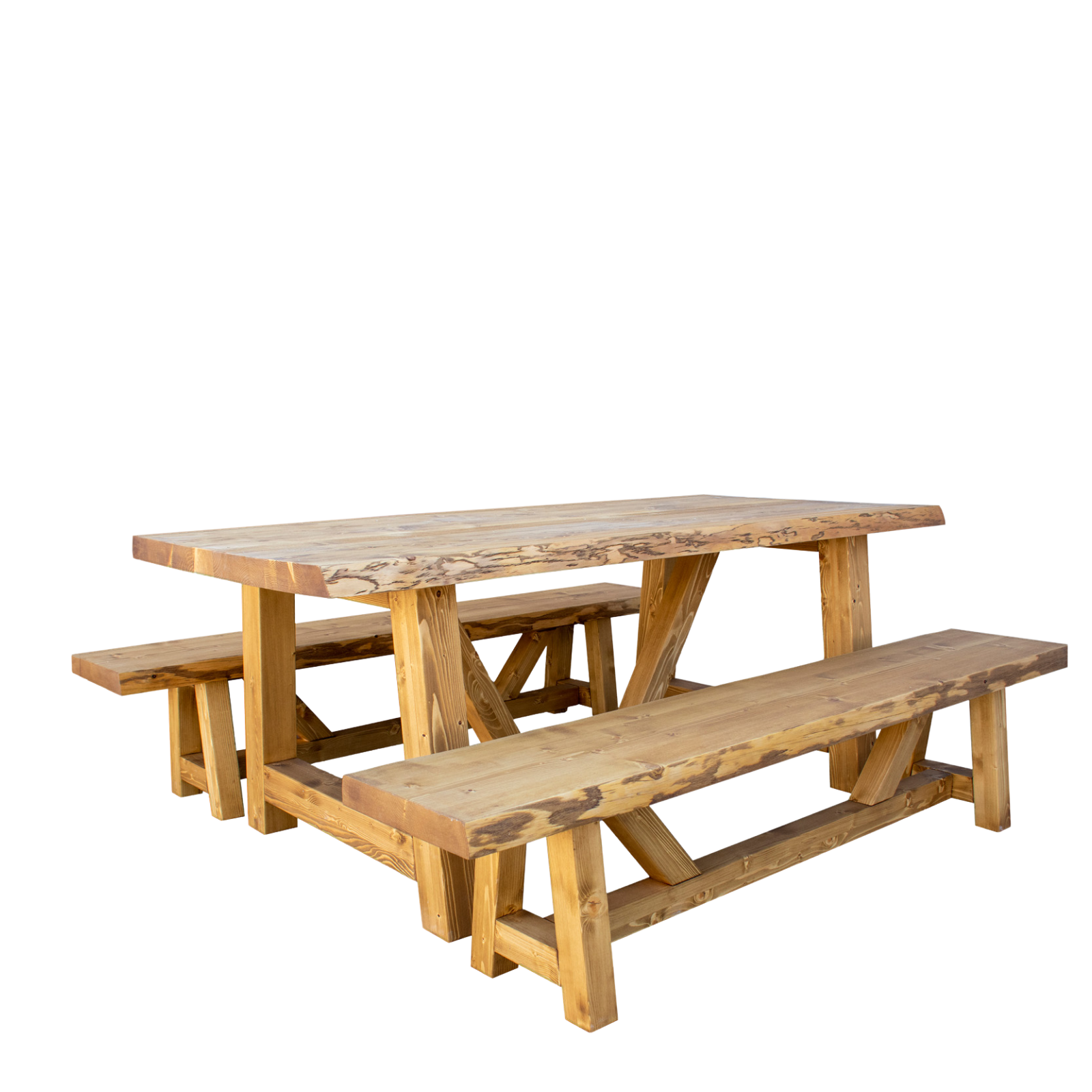 Cet élégant ensemble table et bancs en pin massif brossé allie confort et style pour créer une ambiance chaleureuse et authentique dans votre salle à manger ou votre chalet de montagne.